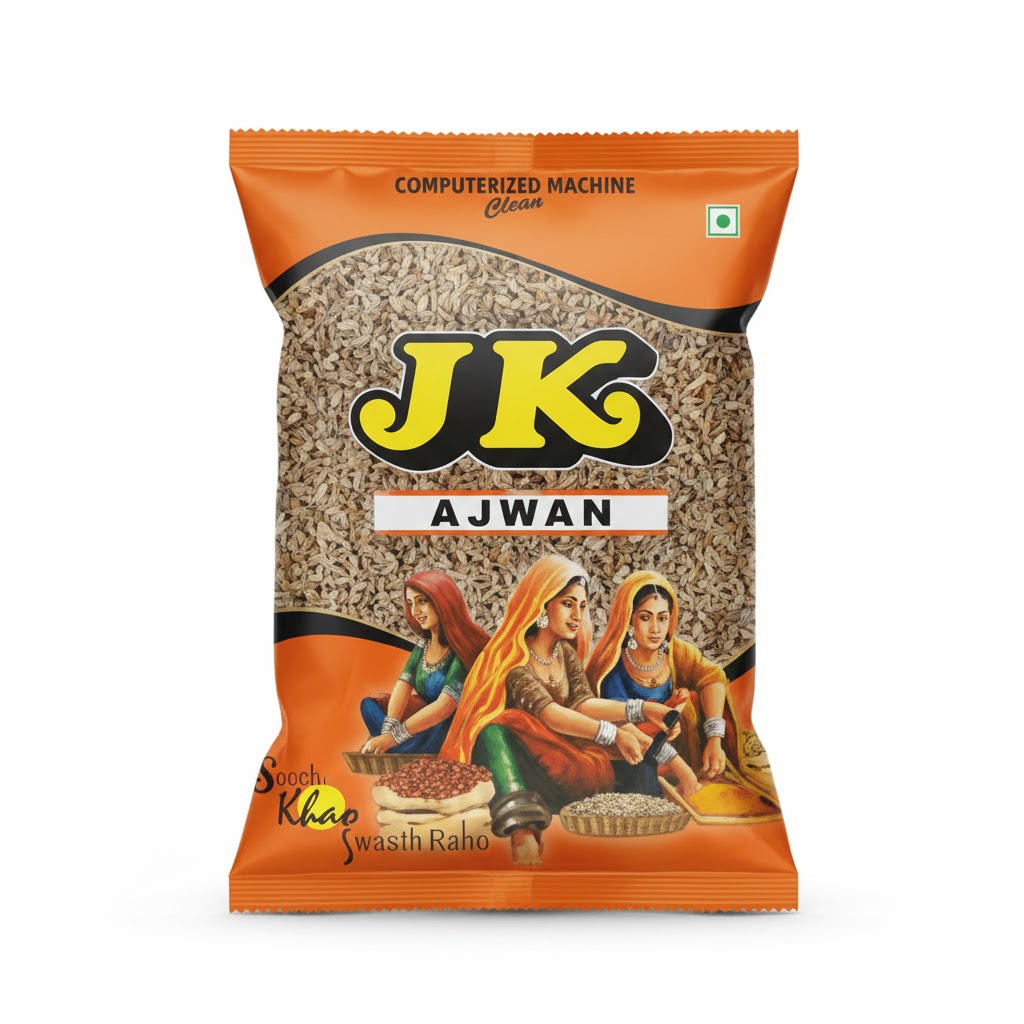 J.K Whole Ajwain is used in Indian cooking for its strong aroma and digestive benefits.