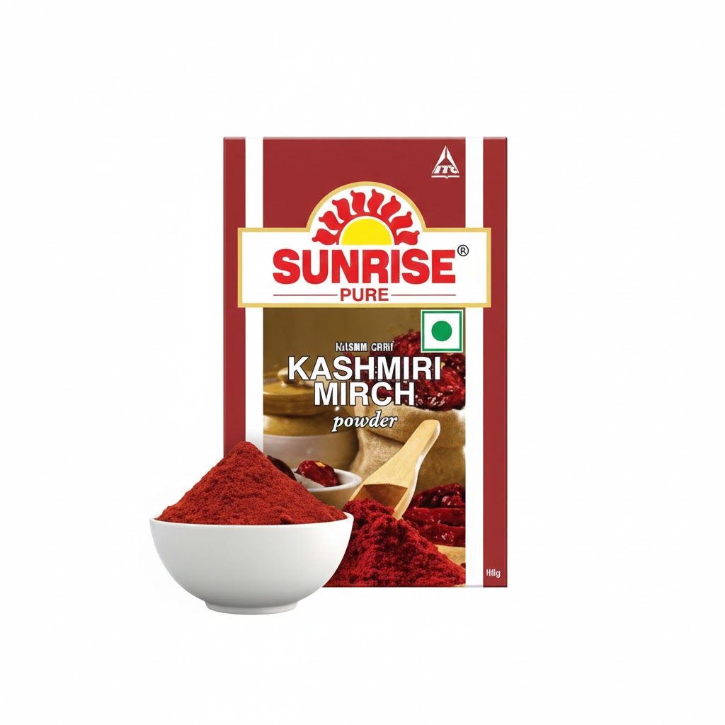 Sunrise Pure Kashmiri Mirch Powder is known for its bright red colour and mild heat, ideal for gravies and tandoori dishes.