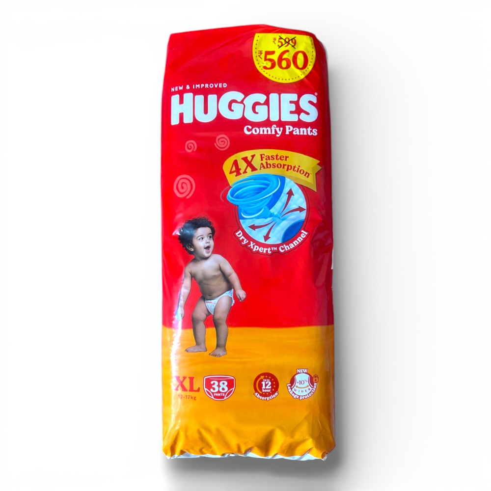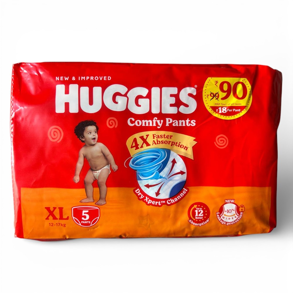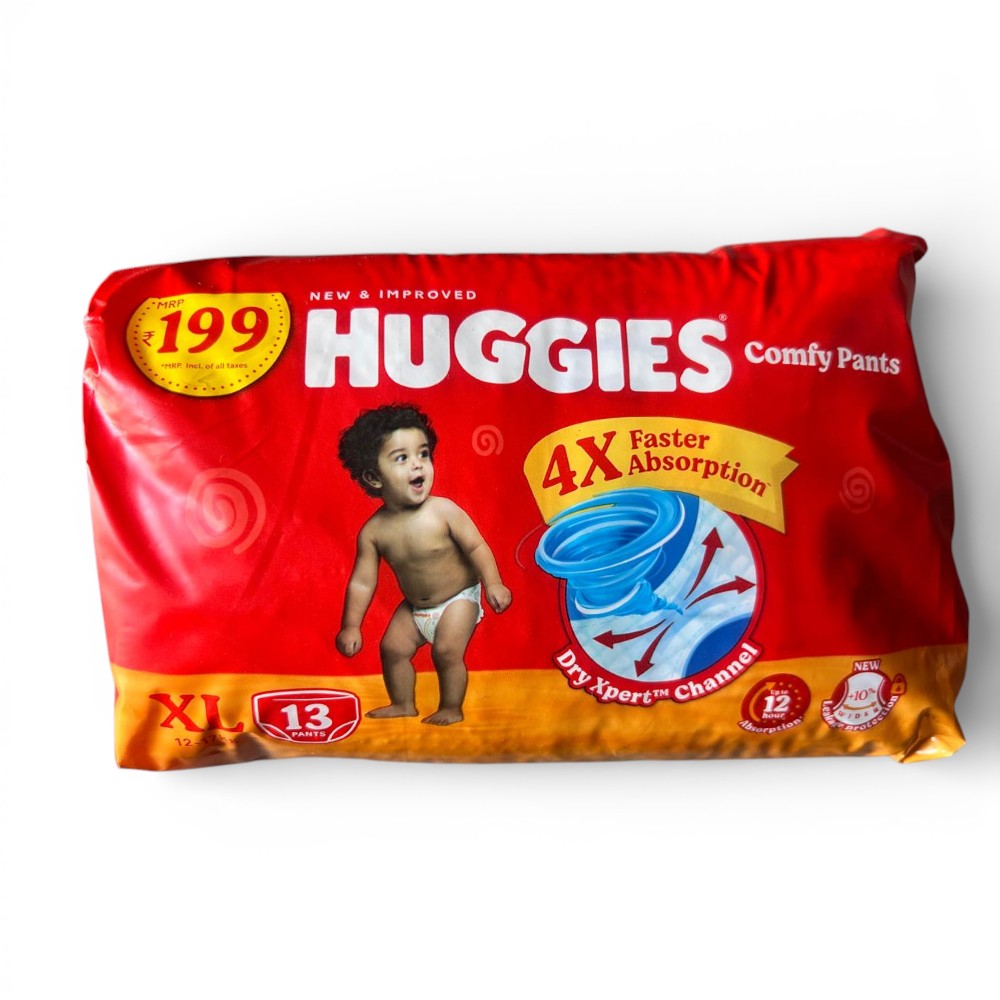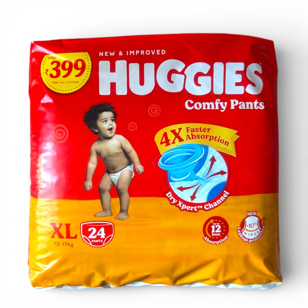 Huggies Comfy Pants XL are designed for babies weighing 12–17 kg and feature a pant-style design with soft fabric and absorbent padding that supports dryness and comfort for active babies.