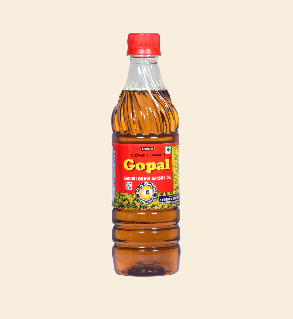 Gopal Kachi Ghani Pure Mustard Oil is extracted using the traditional cold-press (kachi ghani) method, which helps retain the natural pungency, aroma, and essential properties of mustard seeds. It adds a distinct flavour to Bengali, North Indian, and Eastern Indian cuisines, making it ideal for curries, fish fry, pickles, and vegetable preparations. The oil heats well, enhances taste, and is commonly used for both cooking and traditional applications. Hygienically processed and packed, it ensures purity, consistent quality, and freshness for everyday household use.