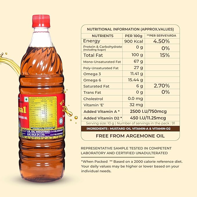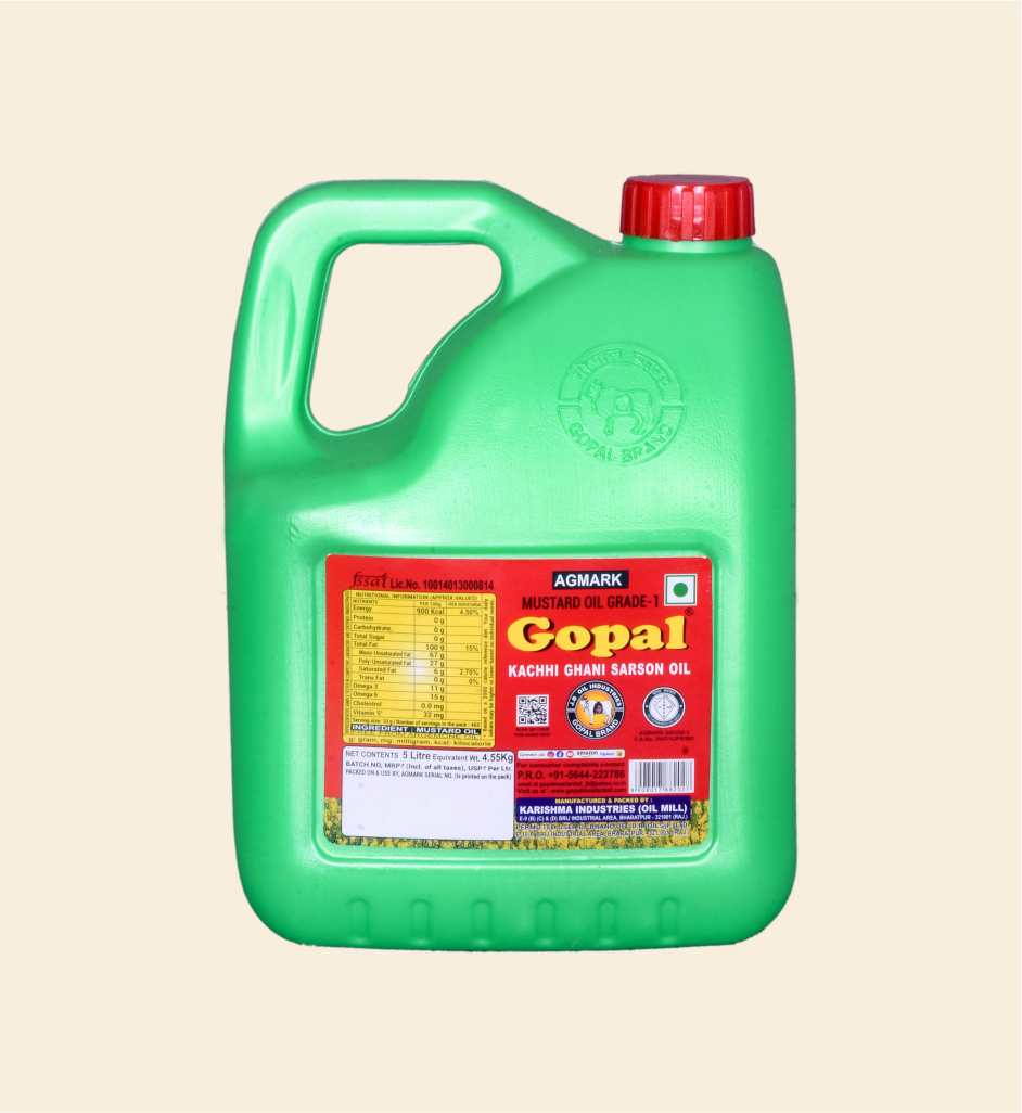 Gopal Kachi Ghani Pure Mustard Oil is extracted using the traditional cold-press (kachi ghani) method, which helps retain the natural pungency, aroma, and essential properties of mustard seeds. It adds a distinct flavour to Bengali, North Indian, and Eastern Indian cuisines, making it ideal for curries, fish fry, pickles, and vegetable preparations. The oil heats well, enhances taste, and is commonly used for both cooking and traditional applications. Hygienically processed and packed, it ensures purity, consistent quality, and freshness for everyday household use.